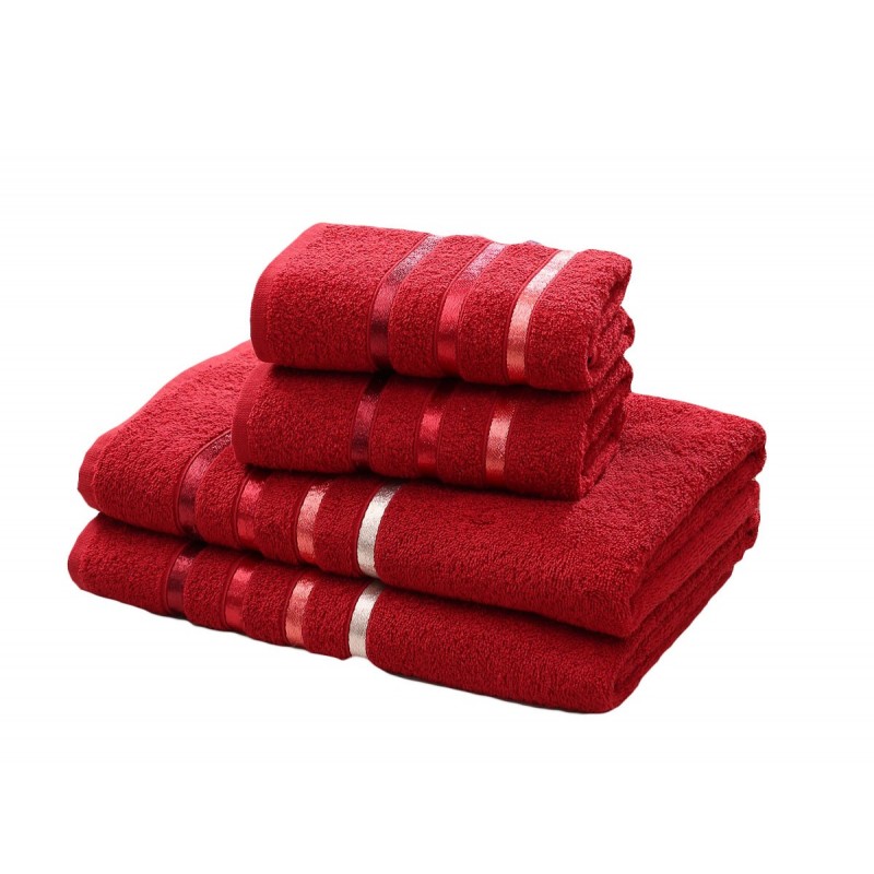 Komplet ręczników łazienkowych frotte BALE wykonany jest w 100% z bawełny i ozdobiony stylową lamówką z przejściem kolorystycznym. Odznaczają się wyjątkową miękkością i doskonałą absorpcją wody. Są odporne na ścieranie, nie blakną i nie elektryzują się. Ręczniki są łatwe w konserwacji i nie wymagają prasowania. Komplet składa się z dwóch ręczników 50x80cm i dwóch ręczników 70x140cm w jednakowym kolorze i związanych kolorową wstążką. Jest to idealny pomysł na elegancki prezent. Skład: 100% bawełna Gramatura: 550g/m2